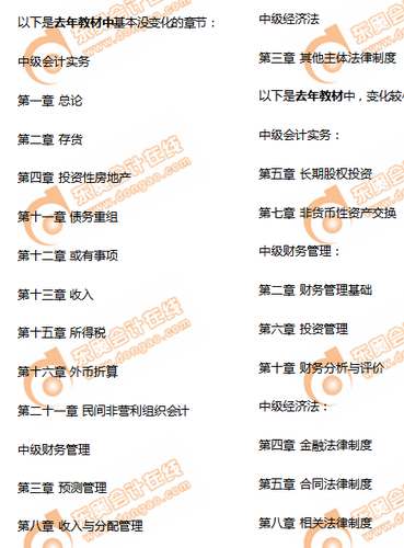 中級會計(jì)職稱考試教材是由財(cái)政部會計(jì)資格評價(jià)中心組織專家編寫的,按照中級會計(jì)職稱考試大綱的要求和最近頒布的法律法規(guī),每年都有機(jī)會做相應(yīng)的調(diào)整。但是調(diào)整的部分,根據(jù)歷年的經(jīng)驗(yàn)只占全部教材的一部分,也就是說可以參考去年的教材進(jìn)行預(yù)習(xí)。小編我在這里為大家總結(jié)了一些在去年的教材中基本沒變化的章節(jié)供各位考生參考??忌笥褌兛梢愿鶕?jù)相應(yīng)的情況考慮預(yù)先學(xué)習(xí)相應(yīng)的章節(jié)。