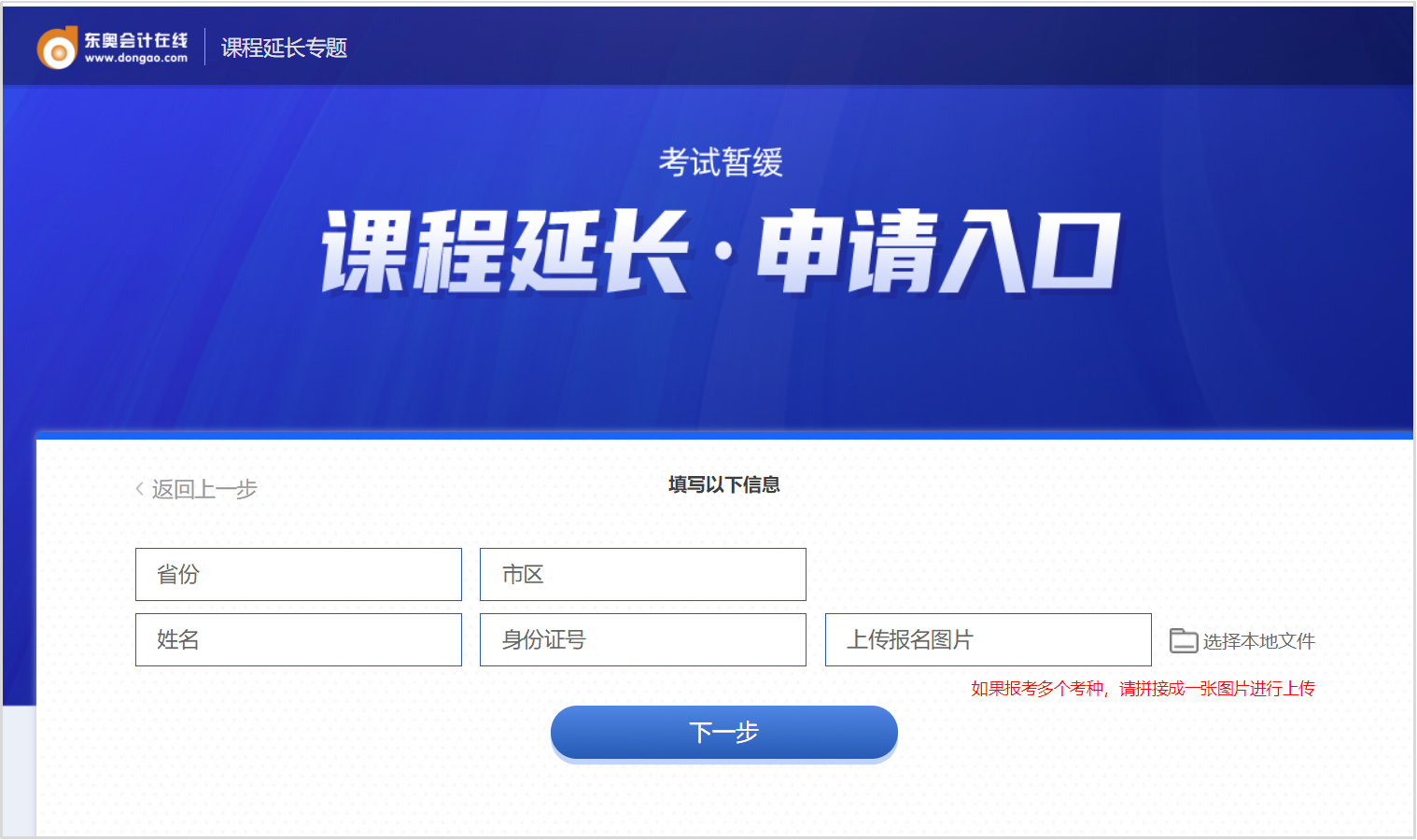? 申請(qǐng)流程:登陸延期網(wǎng)址→選擇對(duì)應(yīng)考種入口→申請(qǐng)延課→填寫(xiě)報(bào)考地區(qū)及個(gè)人信息→提交申請(qǐng)→3個(gè)工作日審核、審核成功后2個(gè)工作日開(kāi)課成功