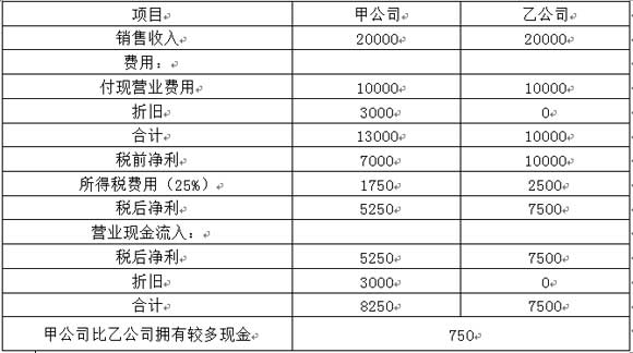 假設(shè)有甲公司和乙公司,全年銷(xiāo)貨收入、付現(xiàn)費(fèi)用均相同,所得稅稅率為25%。兩者的區(qū)別是甲公司有一項(xiàng)可計(jì)提折舊的資產(chǎn),每年折舊額相同。兩家公司的現(xiàn)金流量如下表所示。