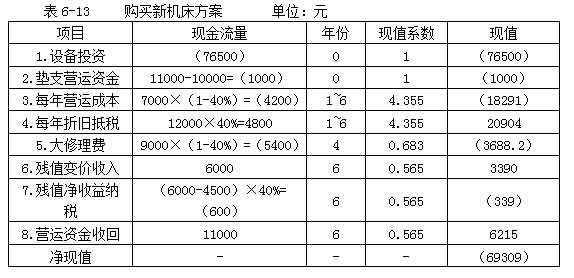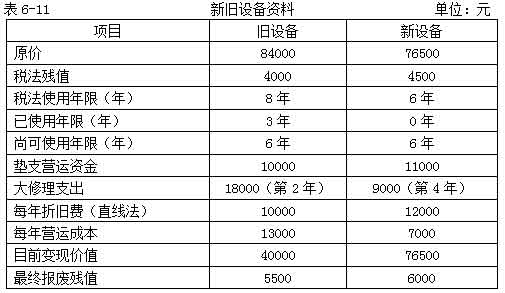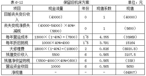 教材【例6-13】宏基公司現(xiàn)有一臺舊機床是三年前購進的,目前準(zhǔn)備用一新機床替換。該公司所得稅率40%,資本成本率為10%,其余資料如表6-11所示。