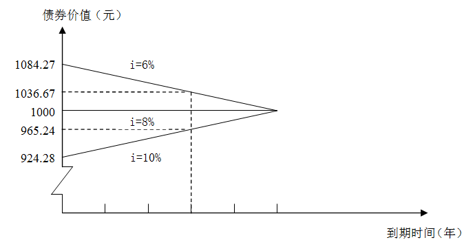 、趶膱D中我們可以看到,對于溢價發(fā)行的債券,到期時間越長,債券價值越大;對于折價發(fā)行的債券,到期時間越長,債券價值越小;