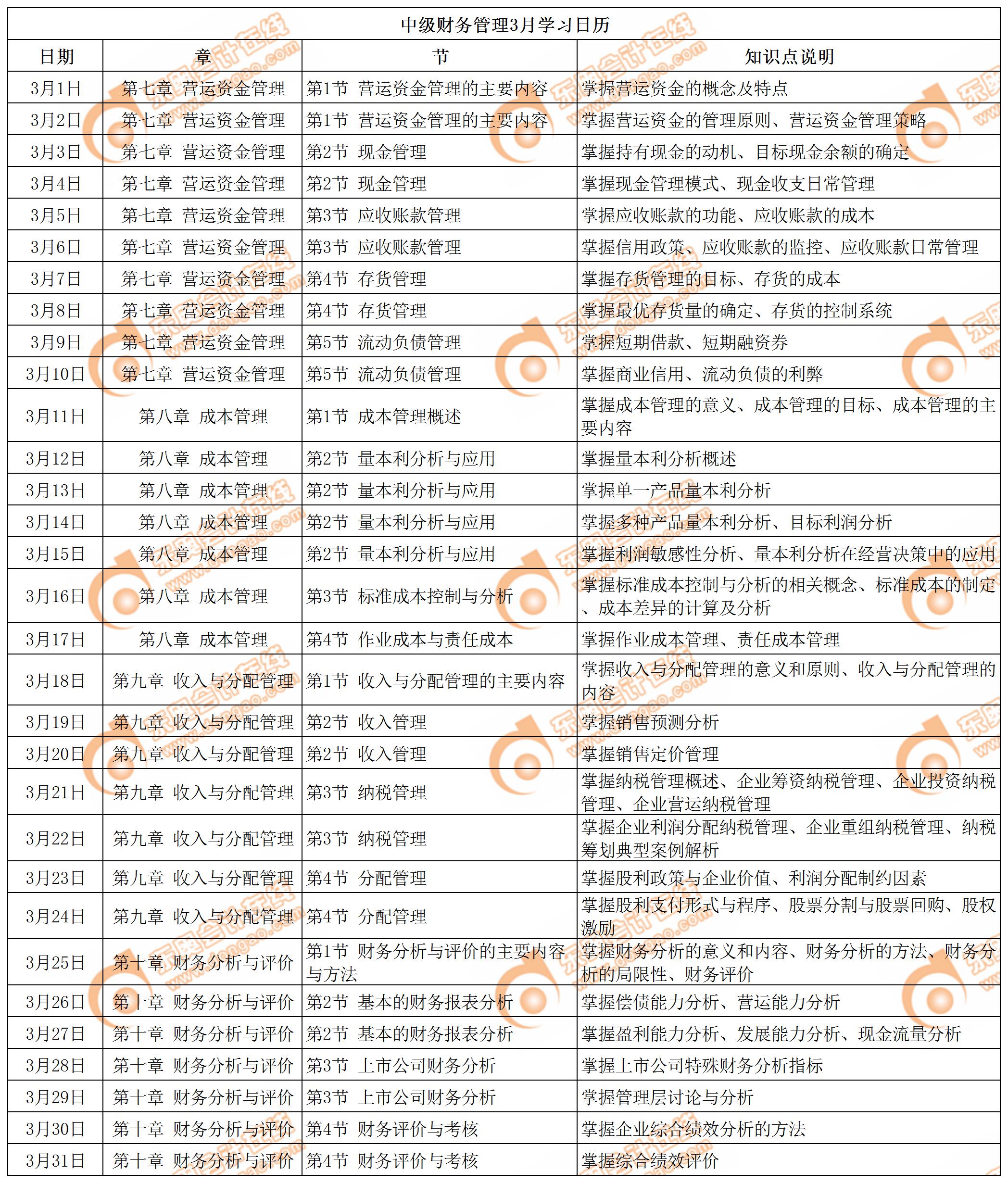 3月份學習日歷(中級財務管理)