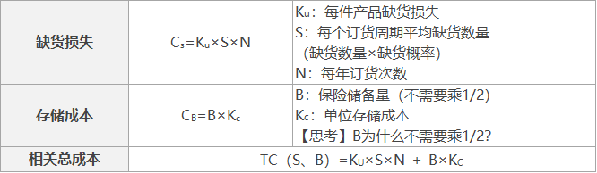 | 目標(biāo) | 設(shè)立保險(xiǎn)儲(chǔ)備,有保險(xiǎn)儲(chǔ)備成本;不設(shè)保險(xiǎn)儲(chǔ)備,可能會(huì)有缺貨損失,找到最佳保險(xiǎn)儲(chǔ)備量,這是使保險(xiǎn)儲(chǔ)備量上的儲(chǔ)存成本與缺貨損失之和最低的保險(xiǎn)儲(chǔ)備量 |