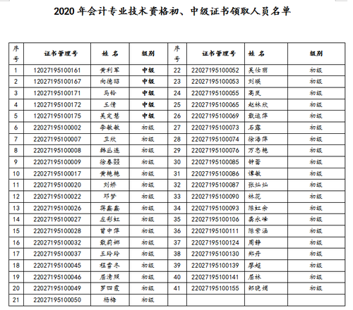 按照有關規(guī)定和要求,我區(qū)2020年度會計專業(yè)技術資格初、中級考試通過人員,領取證書通知: