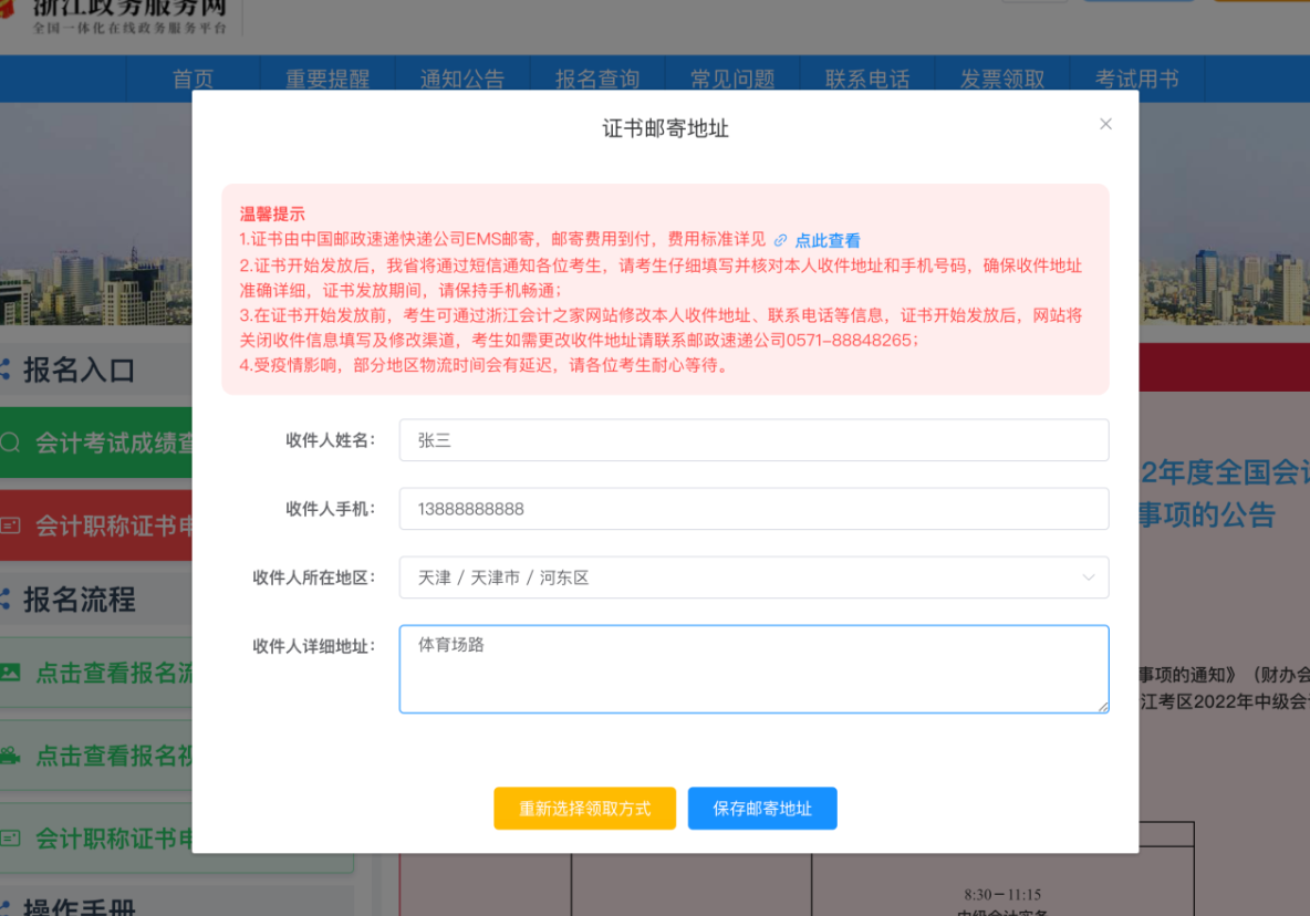 2.在證書開始發(fā)放前,請考生仔細(xì)填寫并核對本人收件地址和手機(jī)號碼,確保收件人信息詳細(xì)準(zhǔn)確,考生可在網(wǎng)上申請截止時間前,通過浙江會計(jì)之家網(wǎng)站修改本人收件地址、聯(lián)系電話等信息。證書開始發(fā)放后,網(wǎng)站將關(guān)閉收件人信息填寫及修改渠道,考生如需更改收件地址的,請聯(lián)系郵政速遞公司0571-88848265;
