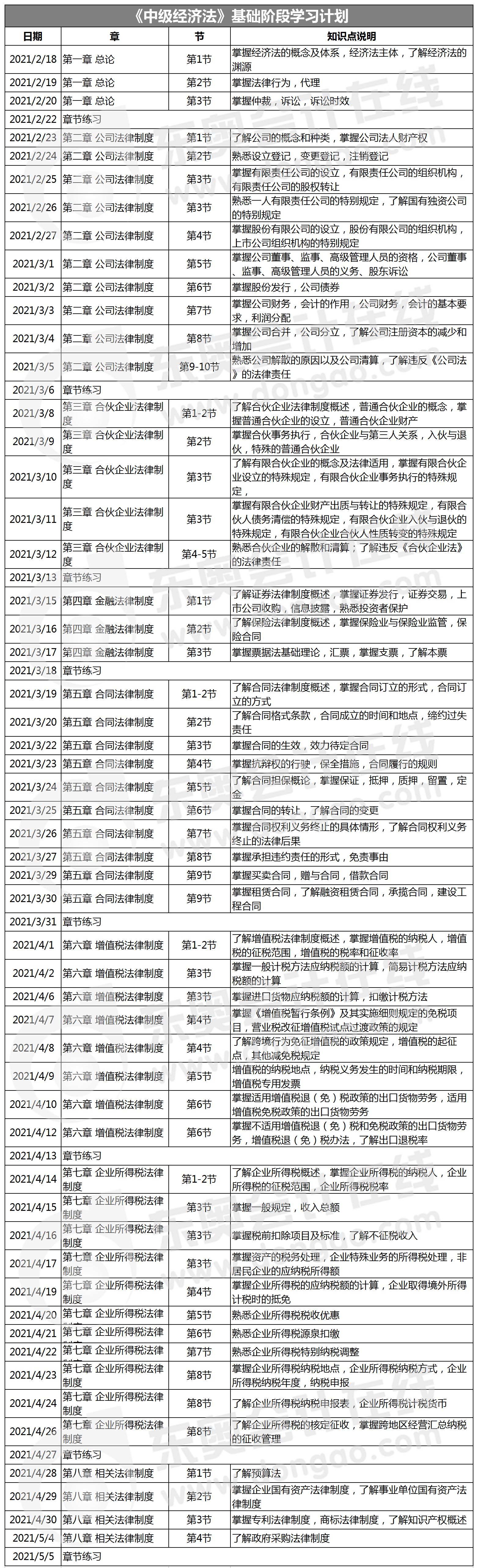2021年基礎(chǔ)階段學(xué)習(xí)計劃(中級經(jīng)濟法)