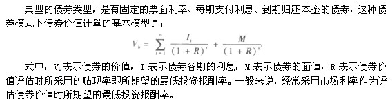 典型的債券類型,是有固定的票面利率、每期支付利息、到期歸還本金的債券,這種債券模式下債券價(jià)值計(jì)量的基本模型是: