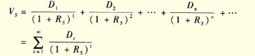 從理論上說(shuō),如果股東不中途轉(zhuǎn)讓股票,投資于股票所得到的未來(lái)現(xiàn)金流量是各期的股利。假定某股票未來(lái)各期股利為Dt(t為期數(shù)),Rs為估價(jià)所采用的貼現(xiàn)率即所期望的最低收益率,股票價(jià)值的估價(jià)模型為: