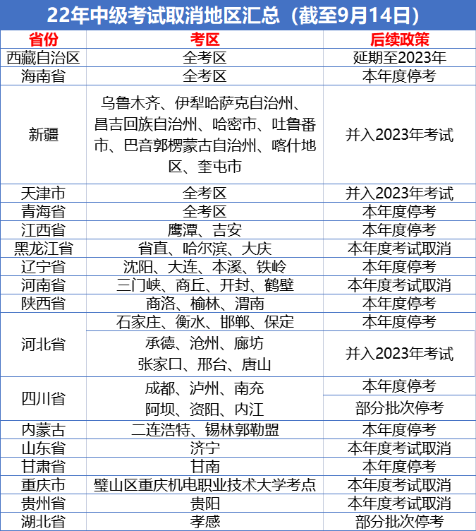2022年的疫情此消彼長,初級會計職稱考試和注冊會計師考試已經(jīng)受疫情影響,個別地區(qū)不得不延期舉行,但在剛剛結(jié)束的中級會計考試中,個別地區(qū)則直接宣布取消2022年考試,并入到2023年考試?!叭∠倍謱λ?021/2022年備考中級考試的考生無疑是晴天霹靂。截至9月14日,全國受疫情影響而取消的考區(qū)已超過40個。