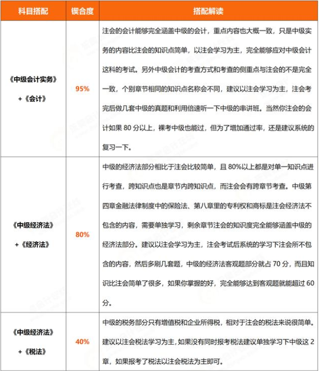 而中級會計職稱考試與注冊會計師考試,在知識點上的重合比例更大,以《中級經(jīng)濟法》和《經(jīng)濟法》為例,部分重合內(nèi)容高達80%;《中級會計實務(wù)》和《會計》這兩部分的知識點契合度甚至高達95%。