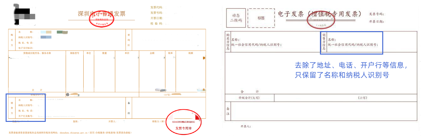 銷售方的信息去除了地址、電話、開戶行等信息,只保留了名稱和納稅人識(shí)別號(hào),財(cái)稅人再也不用糾結(jié)地址等信息需不需要填寫完善,不完善可不可以報(bào)銷。
