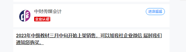 根據(jù)“全國會計資格評價網(wǎng)”-考試用書訂購頁面二維碼后,進入中財傳媒會計店鋪中級會計教材頁面得知,2023年中級會計考試官方教材將于3月中旬開始上架銷售,請各位考生耐心等待。(去購買>>