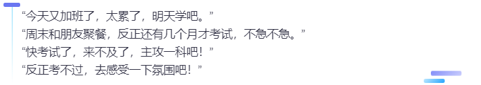 “不想告訴別人我考了中級,要不沒考過的時候他們來問,太尷尬?!薄熬芙^朋友聚會邀請的時候會找理由,反正不會說自己在備考。”“問就是沒好好學(xué),總不能承認自己沒考過是智商問題吧!”很多中級二戰(zhàn)考生都想“悄悄努力,然后驚艷所有人。”可當知道自己沒有通過考試的那一刻,心里終歸是有一些失落和懊悔的。但是失落懊悔就不考了么?自己的職業(yè)生涯就不需要進步了么?所以與其沉浸在“你沒考過???”“你不是考中級?”這樣的“無心之言”中內(nèi)耗,不如沉下心,擺正心態(tài),認真學(xué)習(xí)。我們只是暫時跌了一跤,爬起來,繼續(xù)向前走!
