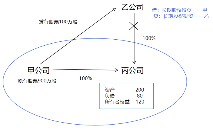 上圖中,甲公司發(fā)行股票100萬股,取得乙公司持有丙公司100%股權,站在乙公司角度體現(xiàn)的是股權換股權。甲公司和丙公司要編制合并財務報表,在合并報表中,甲公司并未流出資產,也未承擔乙公司原債務,因此有觀點認為,在合并財務報表中被合并方的資產和負債可以按賬面價值入賬。合并方的長期股權投資代表的是被合并方的凈資產或凈資產的份額,所以同一控制下企業(yè)合并形成的長期股權投資按被合并方凈資產賬面價值份額入賬。