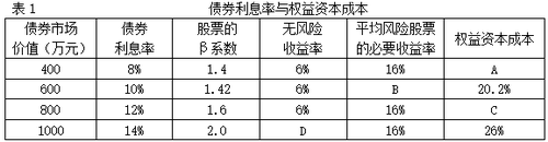 【綜合題1】某公司息前稅前利潤為600萬元,公司適用的所得稅稅率為25%,公司目前賬面總資金為2000萬元,其中80%由普通股資金構成,股票賬面價值為1600萬元,20%由債券資金構成,債券賬面價值為400萬元,假設債券市場價值與其賬面價值基本一致。該公司認為目前的資本結構不夠合理,準備用發(fā)行債券購回股票的辦法予以調整。經(jīng)咨詢調查,目前債券利息率和權益資金的成本情況見表1: