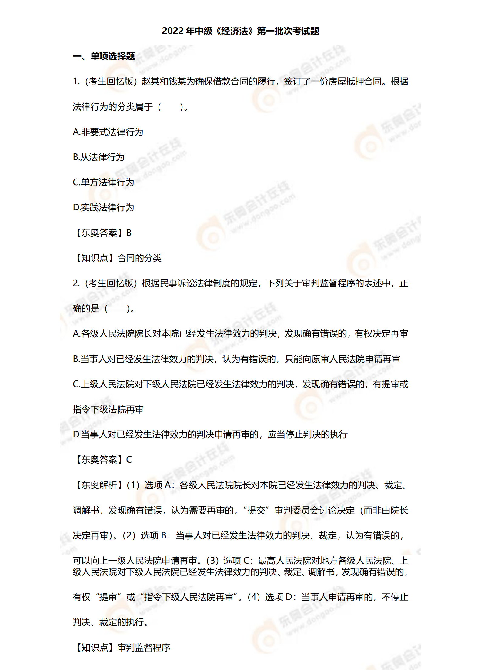 2022年中級(jí)會(huì)計(jì)經(jīng)濟(jì)法考試題及參考答案第一批次_考生回憶版