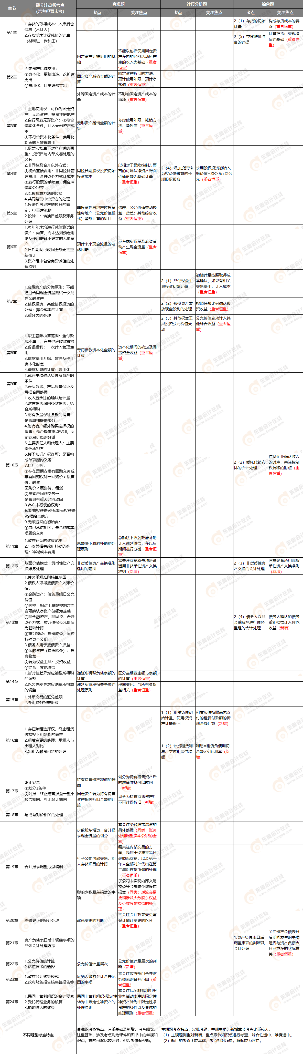 為了幫助后面批次考生對(duì)已考過(guò)的考點(diǎn)及考情的了解,按照章節(jié)順序、題型分類,對(duì)已考過(guò)題目的考點(diǎn)進(jìn)行劃分。依據(jù)當(dāng)前試卷,總結(jié)各章知識(shí)點(diǎn)的考查方式、考查重點(diǎn)或坑點(diǎn),并延伸提示了同類考查重點(diǎn)或考點(diǎn)變形。同時(shí)針對(duì)暫未考查到的高頻考點(diǎn)進(jìn)行適當(dāng)提示。具體內(nèi)容如下?。c(diǎn)擊可查看大圖)