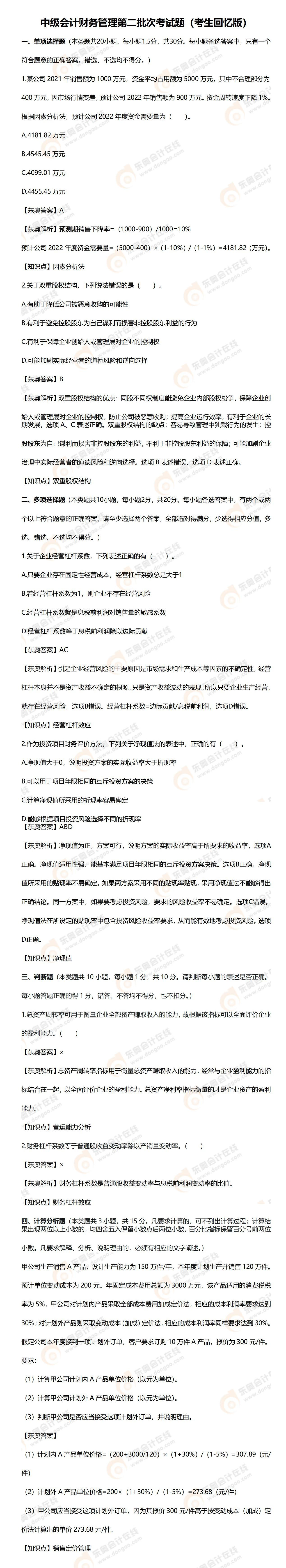 2022年中級(jí)會(huì)計(jì)財(cái)務(wù)管理考試題及參考答案第二批次_考生回憶版