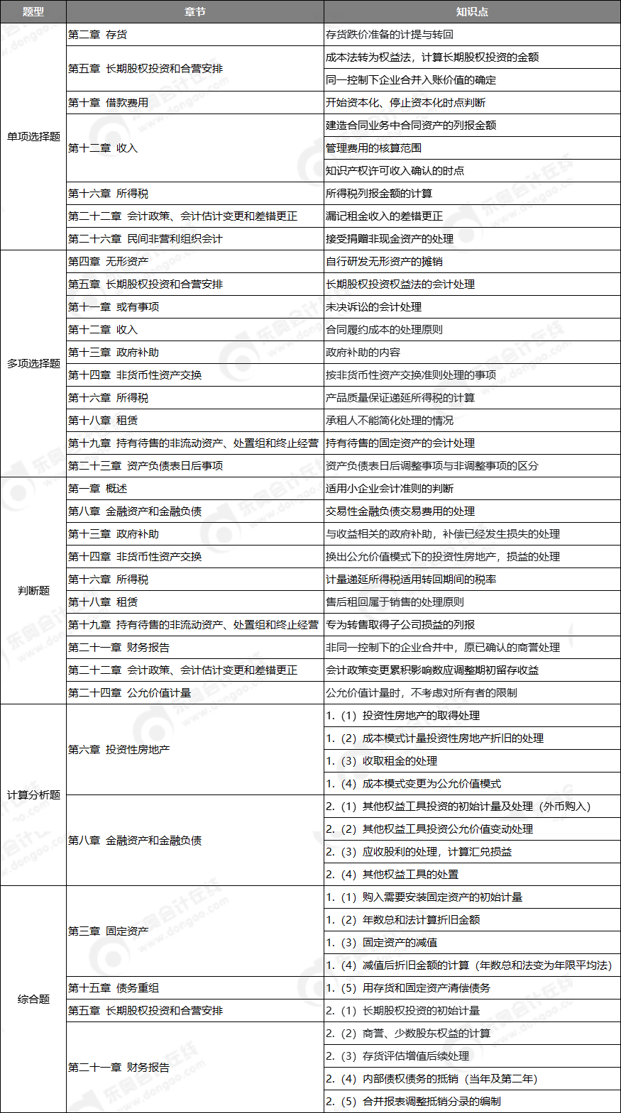 考題依然是秉持“重點(diǎn)恒重”和“逢新必考”原則,第六章 長期股權(quán)投資、第十三章 金融資產(chǎn)、第二十一章 財(cái)務(wù)報(bào)告三章,屬于歷年考題的恒重點(diǎn)考點(diǎn),在本套試卷中以主觀題形式考查。