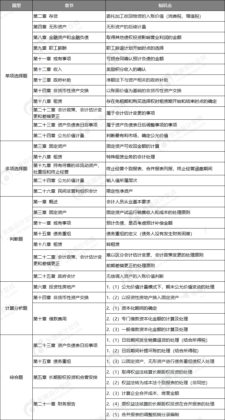 考題依然是秉持“重點恒重”和“逢新必考”原則,第六章 長期股權投資、第二十一章 財務報告、第二十三章 資產負債表日后事項,屬于歷年考題的恒重點考點,在本套試卷中以主觀題形式考查。