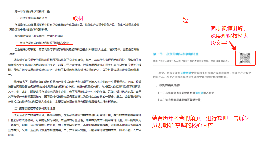 以《中級(jí)會(huì)計(jì)實(shí)務(wù)》中的“存貨”章節(jié)為例。東奧會(huì)計(jì)在線的《輕松過(guò)關(guān)?一》輔導(dǎo)書可以從以下幾個(gè)方面幫助大家理解教材,高效學(xué)習(xí)。首先,這個(gè)章節(jié)需要學(xué)什么、往年考查的情況、最新教材變化等內(nèi)容。然后,提煉考點(diǎn),將復(fù)雜的專業(yè)術(shù)語(yǔ)用簡(jiǎn)單地、便于理解的語(yǔ)言解釋出來(lái),然后結(jié)合歷年考試方向,提煉核心。通過(guò)課后的“真題(考生回憶改編版)”熟悉考點(diǎn)的命題方向和出題角度,將知識(shí)點(diǎn)放在實(shí)戰(zhàn)中演練,做題鞏固。