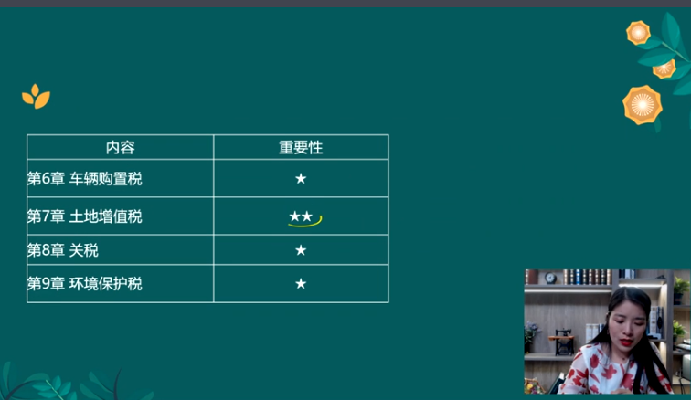 共九章。其中重點(diǎn)為第二章章節(jié)增值稅、第三章消費(fèi)稅;其次是第五章資源稅、第七章土地增值稅,在小稅種中算是比較重要的知識(shí)點(diǎn),可以以主觀題的方式進(jìn)行考查;其他章節(jié)均為小稅種,多以客觀題的方式進(jìn)行考查。