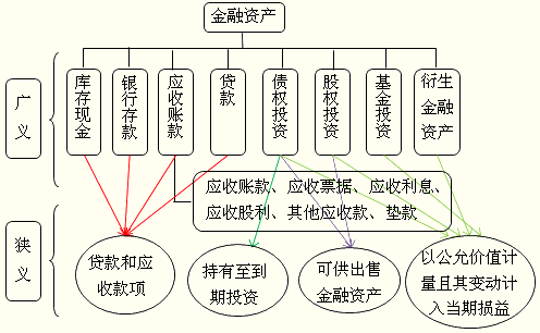 、劢鹑诠ぞ叽_認(rèn)和計(jì)量準(zhǔn)則(第22號(hào)準(zhǔn)則)中所規(guī)范的金融資產(chǎn)是狹義的金融資產(chǎn),即上圖所示的四類金融資產(chǎn),是本章的主要內(nèi)容。廣義金融資產(chǎn)中的部分內(nèi)容,如長(zhǎng)期股權(quán)投資,不屬于上述四類金融資產(chǎn)。