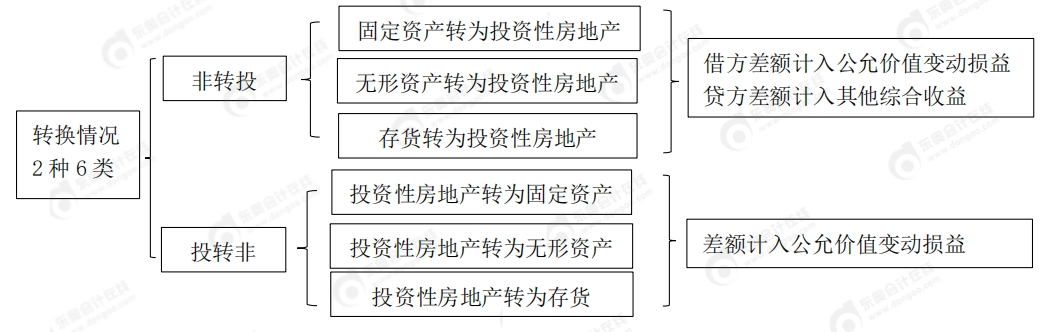 【提示】此處所指非投資性房地產(chǎn),指固定資產(chǎn)(房)、無(wú)形資產(chǎn)(地)和房地產(chǎn)開(kāi)發(fā)企業(yè)的存貨(商品房)。故“非投資性房地產(chǎn)”與“投資性房地產(chǎn)”之間的轉(zhuǎn)換分2類共6種情況。