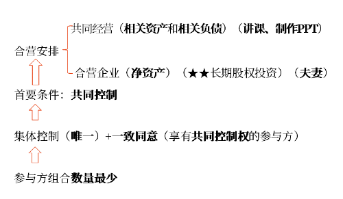 特征 | 合營安排同時具有以下特征(2個特征)(男女結婚:結婚證) 1.各參與方受到該安排的約束 2.兩個或兩個以上的參與方對該安排實施共同控制 |