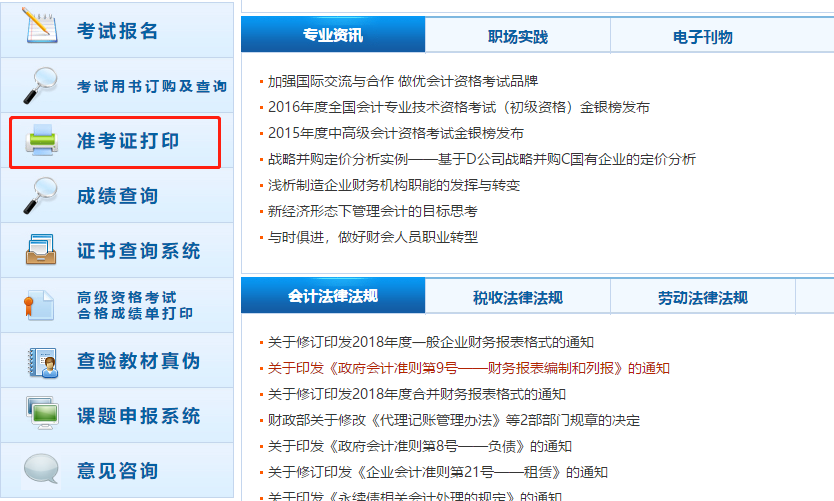第一步:進入全國會計資格評價網(wǎng)http://kzp.mof.gov.cn/,首頁選擇【準(zhǔn)考證打印】;